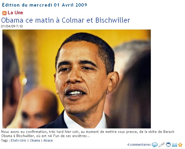 | Dans le journal L'Alsace, c'est Barack Obama qui sert d'appât. "Arrivé hier soir en Grande-Bretagne pour le G20 de ce jeudi, Barack Obama fera deux sauts de puce, aujourd’hui, à Bischwiller et à Colmar, sur la trace de ses racines alsaciennes, et pour rendre hommage à Auguste Bartholdi, le créateur de la Statue de la Liberté. Nous en avons eu confirmation définitive hier soir à 23 h : le président américain, Barack Obama, avance de quelques jours sa venue en Alsace, où il assistera vendredi et samedi au Sommet de l’Otan, pour visiter Bischwiller, qui a vu naître l’un de ses ancêtres. Initialement, il voulait profiter du Sommet de l’Otan pour se rendre dans la cité du Nord du Bas-Rhin, mais les exigences de sécurité ne l’ont pas permis : pas question de sortir du périmètre mis en place pendant le Sommet, alors que des milliers de manifestants anti-Otan sont en embuscade." |