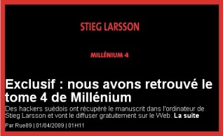Rue89 frappe fort avec ce titre : "Nous avons retrouvé le tome 4 de Millenium". Depuis la mort de l'auteur suédois de la trilogie, Stieg Larsson, sa famille et son ex-compagne se déchirent pour le partage des droits de ce best-seller. Longtemps, ont couru les rumeurs sur un Tome 4 inachevé, enfermé dans son ordinateur portable, qui pourrait un jour paraître.